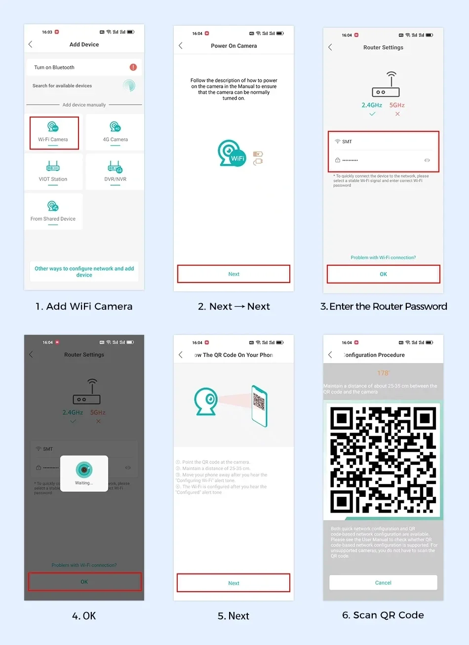 3 Conecte a câmera através da banda de rede Wifi de 2,4 GHz, siga as 6 etapas da imagem para conectar e você poderá configurá-la com sucesso.